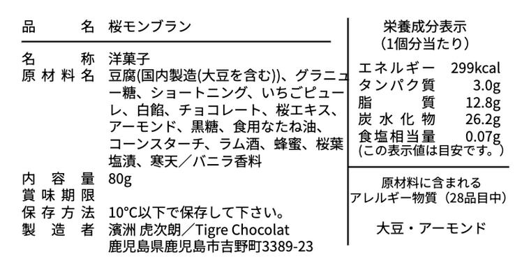 原材料:豆腐(国内製造(大豆を含む))、グラニュー糖、ショートニング、いちごピューレ、白餡、チョコレート、桜エキス、アーモンド、黒糖、食用なたね油、コーンスターチ、ラム酒、蜂蜜、桜葉塩漬、寒天/バニラ香料